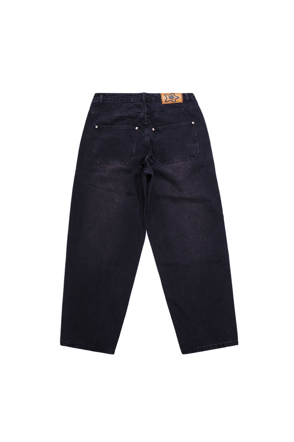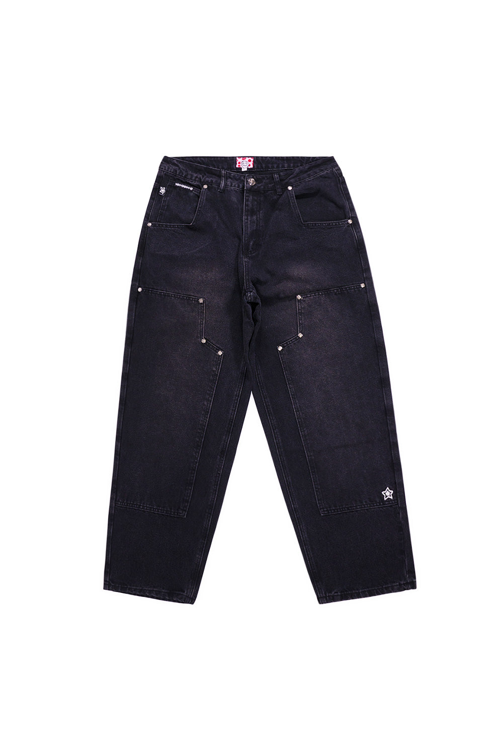 Gefertigt aus gewaschenem Denim-Stoff, überzeugt die Jeans durch ihren baggy Fit, der sowohl Komfort als auch eine entspannte Ästhetik bietet – perfekt für das Skaten oder den lässigen Streetwear-Look. Das Double-Knee-Design sorgt für zusätzliche Verstärkung an den entscheidenden Stellen, was sowohl die Haltbarkeit als auch den markanten Stil verbessert. Dekorative Nieten über die gesamte Hose verleihen dem Design einen einzigartigen, auffälligen Akzent, der sie von herkömmlichem Denim abhebt.