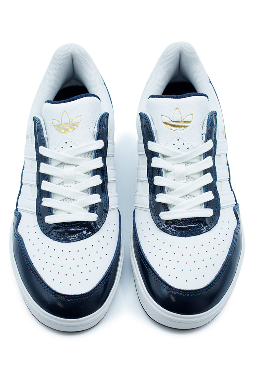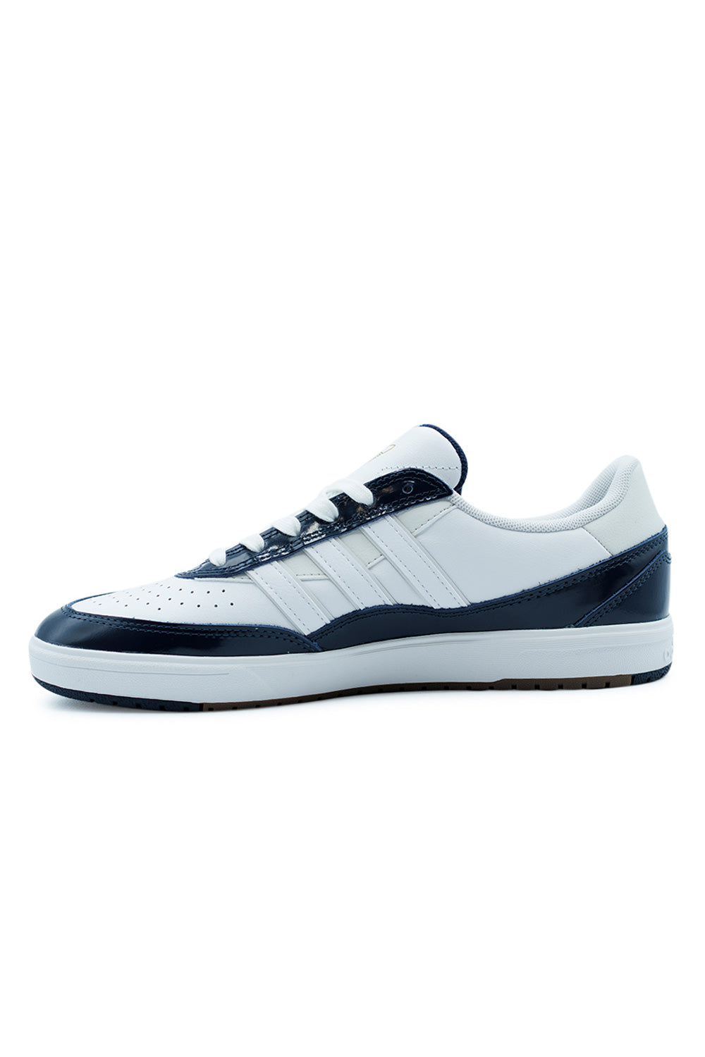 The white leather upper is enhanced with elegant patent leather overlays, while golden logos on the tongue and side add premium flair. The rubber cup sole, glued for durability, includes heel cushioning for impact support. A padded ankle area ensures all-day comfort and stability.